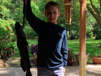 Jacob Koepp, age nine, caught this freshwater catfish with a grub in his Grandmother’s pond in Goodbee, LA.