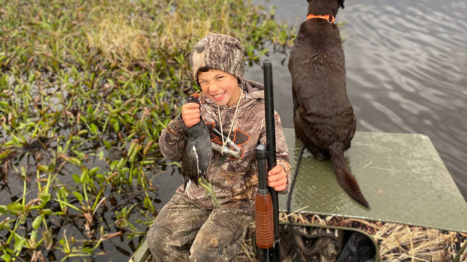 Hudson Fields holds up his first gallinule, which was retrieved by chocolate lab Cali, on a hunting trip in Houma.