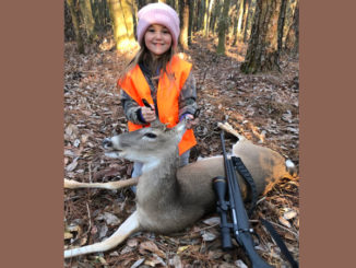 Six-year-old Annabelle Saurage connected with her first shot on this Alabama spike buck while hunting with her paw paw and brother.