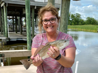 Alli Millet caught her first redfish with a Carolina rig and shrimp off a dock in Bayou Dularge on June 4. She was attending a “campwarming” weekend with friends!