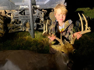 Connor Campbell shot his first buck, an 11-point with an 18 ½-inch inside spread, with his Savage 7mm-08 at 75 yards in Southeast Kansas. The buck scored 143.