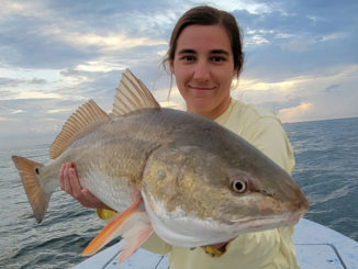 Megan Guidry with a bull red caught out of Fourchon using squid on the bottom.