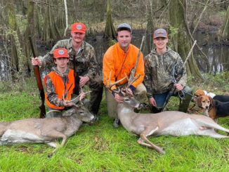 Cody Cambre, Dawson Ducote, Brian Babin and Cooper Babin with two bucks killed within minutes and feet from each other while running dogs at Sandy Bayou Sportsman’s Club in Denham Springs.