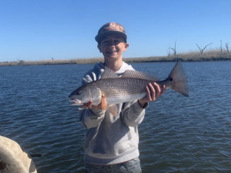 Drake Burchfield with a beautiful Hopedale redfish he caught on a cold January day in the marsh.