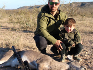Beau Trapani, 4, with his dad, Jacob Trapani. Beau harvested his first doe and buck in Ozona, Tex.