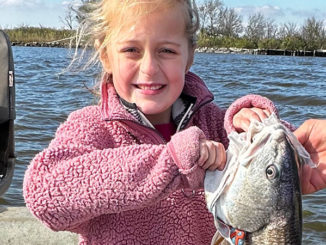 Marèt Kibodeaux, 7, with her first redfish! It was caught at Pecan Island on Nov. 24 2023.