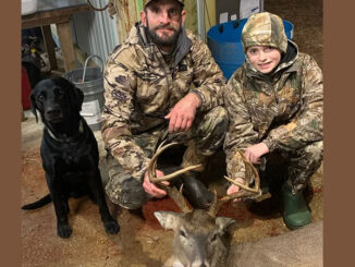 Caleb Rodrigue, 12, with his dad, Shane Rodrigue, and the 8-point buck he got in Mississippi back in January 2024.