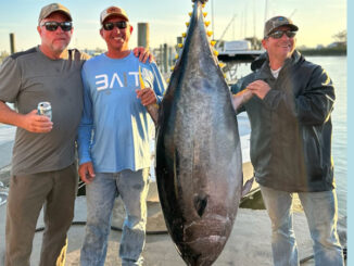 This 243.8-pound tuna was caught by Phil Laux and Trevor Taghon while fishing out of Venice with Capt. Brady Oncale of Last Day Sportfishing on Nov. 19, 2023.