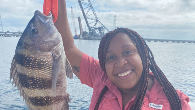 As her husband was pulling up the anchor with the boat in neutral, Cassini Williams reeled in this 22 inch, six pound sheepshead at the Trestles and the Twin Span Bridge on Nov. 11, 2020.