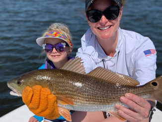 Violet Seymour, 5, hooked and reeled in her first redfish while fishing out of Bayou Grand in the Biloxi marsh with her mother Courtney, her father Brian, and their dog Scout in Sept. 2020.