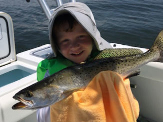 Four-year-old Sanders caught this nice speckled trout on a live croaker while fishing at Flatboat Key.
