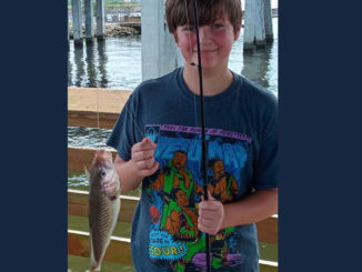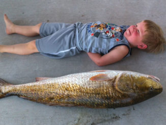 Roxanne Lousteau’s grandson Jake Fowler sizing up a bull red she caught in Grand Isle.