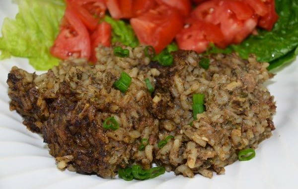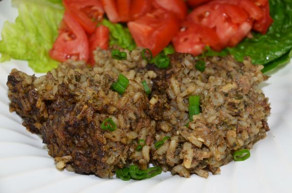 Cut the gristle from the gizzards and place them in a food processor or meat grinder. Add the livers and chop or grind them. Set aside. In a microwave safe dish, mix the flour and oil together for a roux. Cook in a microwave on high for 18 minutes, until the roux is a deep caramel color. Stir the roux frequently during cooking. When the roux is done, add the onions and celery, stir and cook on high 5 minutes. Stir in green onions, parsley, garlic and livers and gizzards and sauté 10 minutes. Add in water, salt and pepper, rice and oysters. Mix thoroughly. Pour into a baking dish and bake at 350 degrees for one hour. Serves 10-12.