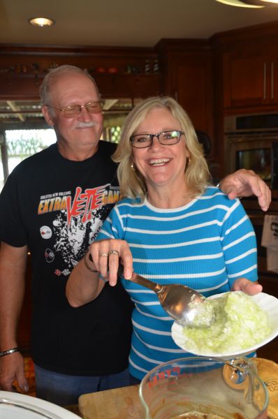 She patted him on the back while he peeled shrimp for her stuffed mirlitons.