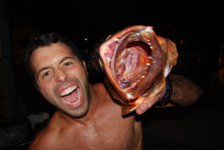 Cubera snappers also sport eye-poppingly large canine teeth that are visible even with the mouth closed, and they have quite fat lips. A fail-safe method of identification is to open the mouth and run a finger (be brave) over the rough tooth patch located in the roof of the mouth. It is triangular in a mangrove snapper, but anchor-shaped in a cubera snapper.