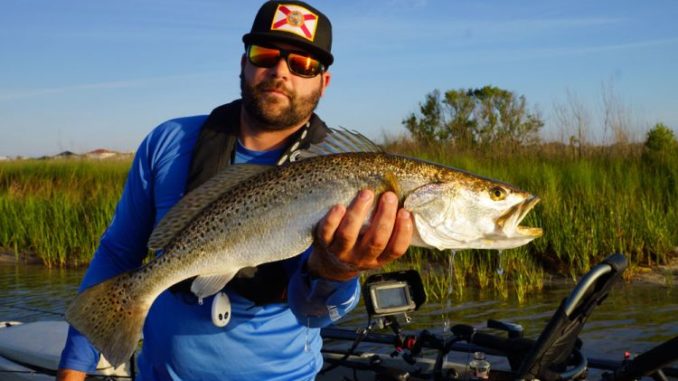 The good news is kayaks are great platforms to pursue trout with topwater lures. The low profile makes it easy to get close to and move with the schools of bait where the trout are hanging out. Rafts of mullet and pogies are usually a sure bet that trout are shadowing them along the edges of the bait school. Working the lure from the low profile, seated position of the kayak aids in not spooking the bait — or the trout.