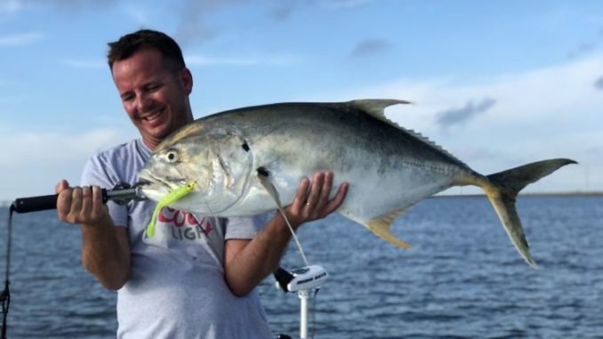 Champagne was hopeful of catching tarpon on the new and extra large soft plastic swimbait he created, but the silver kings of the ocean couldn’t be found, so he targeted jacks. As he did, he talked about a new artificial lure sure to pique the interest of saltwater anglers everywhere interested in catching bigger fish. “Big fish eat big fish. Small fish eat small fish,” he said.