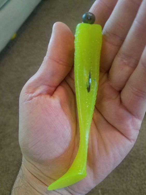 A 1-ounce jighead “fits it very naturally,” he said, adding that a 5/0 hook also matches up with it perfectly.