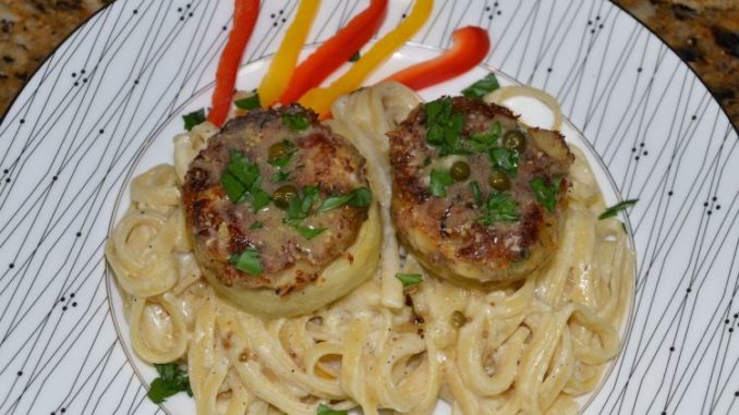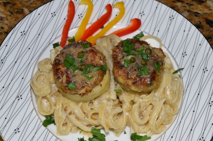 Inspect the crabmeat for shells, rinse in a colander, and set aside to drain. Sauté the onions, celery and bell peppers in 3 tbsp. olive oil in a pan until soft. Add three cloves minced garlic, Italian Seasoning, 1/2 tsp. salt and 1/2 tsp. black pepper. Sauté for one to two more minutes. Add 1/2 tbsp. lemon juice, bread crumbs, 1/2 cup Parmesan cheese, egg and mayonnaise. Mix well, then gently fold in the crabmeat. Form the mixture into crab cakes about the size of the artichoke bottoms. Refrigerate until ready to stuff the artichokes. Fry both sides of the artichoke bottoms in 1/2 cup olive oil over medium heat until lightly browned. Once the artichokes have cooled stuff them with the crab cakes. In another pan, sauté eight cloves garlic in two sticks of melted butter for 30 seconds to cook off the rawness and allow the aroma to hit its peak. Add 4 tbsp. olive oil, the juice of two lemons, capers, and Dijon mustard. Sauté an additional 1-2 minutes. Remove from heat and set aside. Break the fettuccine in half and cook according to the directions on the package. Make a sauce for the fettuccine by melting two sticks of butter in a large skillet. Add garlic powder, 1 tsp. salt, 1 tsp. black pepper, Italian cheese, 1 cup shredded Parmesan cheese, milk and whipping cream. Stir continuously until the cheeses have melted. Stir the fettuccine into the sauce and mix well. Place a serving of fettuccine on a plate. Top it with two stuffed artichoke bottoms. Generously drizzle the garlic butter sauce over the crab cakes and serve.