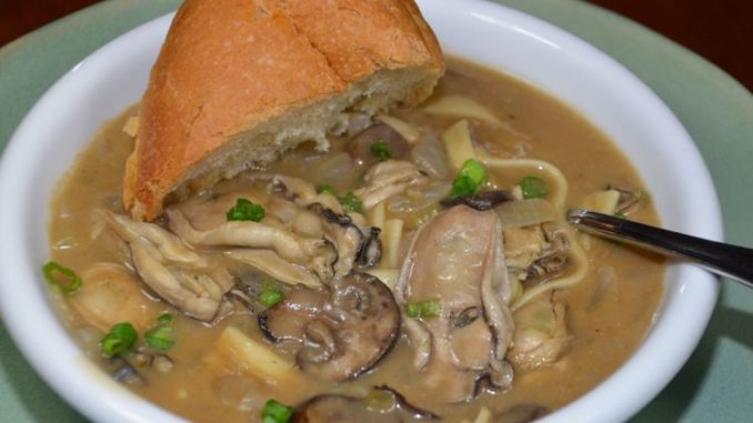Make a roux with the olive oil and flour on moderate heat, stirring constantly to keep it from burning. (The olive oil roux will be dryer and lighter than a typical roux.) When the roux is light brown it is done. Remove the pot from the heat and allow it to cool slightly. Add the onions and stir to coat them with the roux. Return to the fire, add the celery and continue to stir. Add 1 cup of water and stir to make a paste. Add another cup of water and mix well. The mixture should have a pudding-like consistency. Sprinkle in oregano, rosemary and thyme. Add three more cups of water and bring to a boil. Add the mushrooms and return to a boil. Lower the heat, cover and simmer about 15 minutes. Add the oysters and their liquor and cook over a very low heat. Pour in another cup of water. Add the fettuccini to the gravy, and stir to keep pasta from sticking. Season with hot sauce and salt to taste. Continue cooking until the pasta is done. (The finished dish will be soupy.)