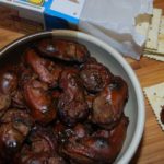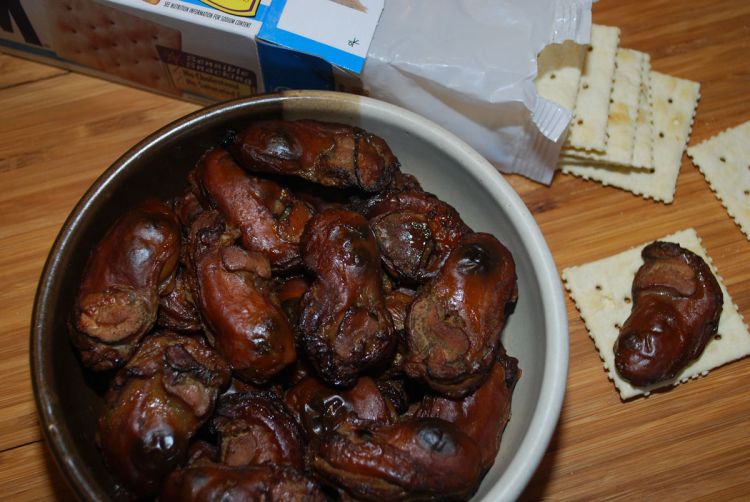 These are moist and succulent with a great mouth-feel. This is a dish to cook on a true side-smoker or a Green Egg, not a barbecue pit or grill. Low temperatures and lots and lots of smoke are the keys to success. The process is a little lengthy so you need to allow four hours for preparation before the one-hour smoking process begins. Sometimes I will do the brining and rinsing the day before I smoke them. They store well overnight in the refrigerator.