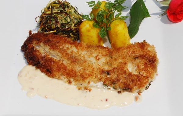 Marinate the fillets in buttermilk for one hour. Sauté the cilantro and shallots in 1 tbsp. butter until tender. Add chardonnay and reduce until almost dry. Add cream and reduce until sauce is thickened. Stir in chipotle peppers. Mix well and remove from heat. Add 4 tbsp. butter and stir. In a separate bowl dredge marinated fillets in Panko bread crumbs to coat. Sprinkle with basil and parsley. Pour olive oil and 1 tbsp. butter into a large skillet. Add fish fillets and fry until brown. Turn the fillets and brown the other side. Spoon sauce around the fillets and serve. Serves 4.