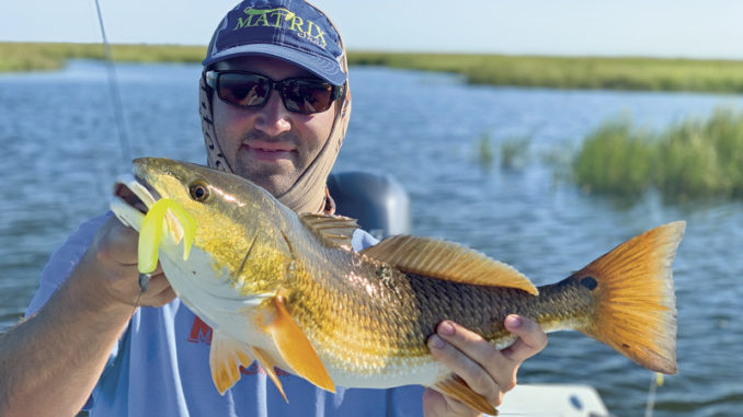 In October, sight-fishing for redfish in the marsh near his home in Slidell with a buddy, both using a Mega Matrix in tiger bait color on back-to-back trips, they both limited out on big, slot redfish using the same durable soft-plastic impaled on a 3/8-ounce jighead.