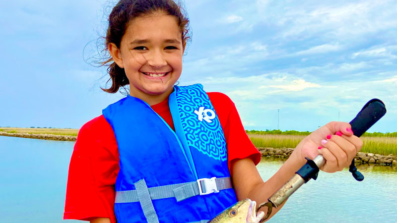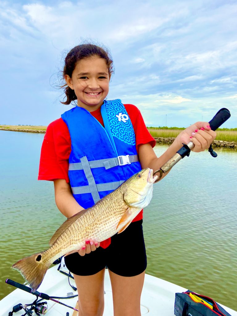 Ashton Goodly caught her first redfish, hooked and hauled in all by herself, on July 22 at Joseph Harbor in Rockefeller Wildlife Refuge.