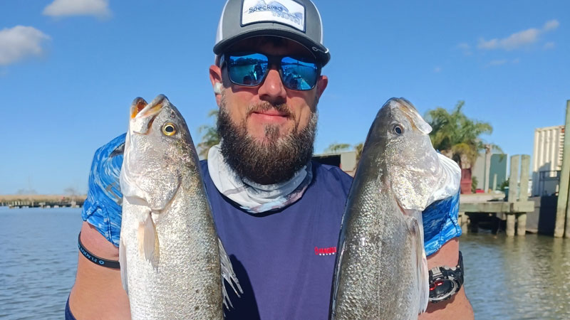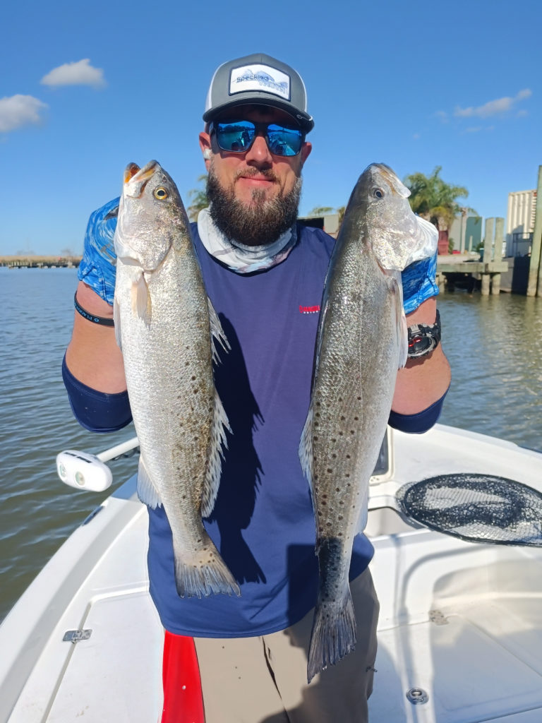 Chris Bell caught some big beautiful speckled trout fishing around Breton Island using a 4-inch Shrimp Creole Matrix Shad on a ⅜ Deathgrip Jig Head.