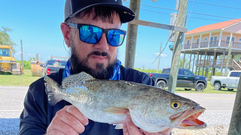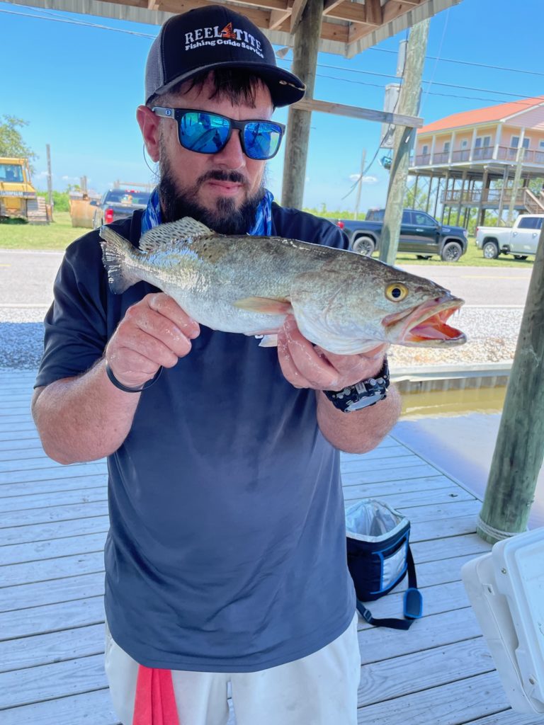 On June 4, Chris Bell fished out of Hopedale/Shell Beach. He made that long run to the Long Rocks but was only catching little small school trout. He decided to search for some clean moving water and when he did it paid off. He was catching beautiful 17″-19″ trout using a Shrimp Creole colored Get’Em Shad under a popping cork. The key was to find duck ponds that drained into a canal with about 8 feet of water.