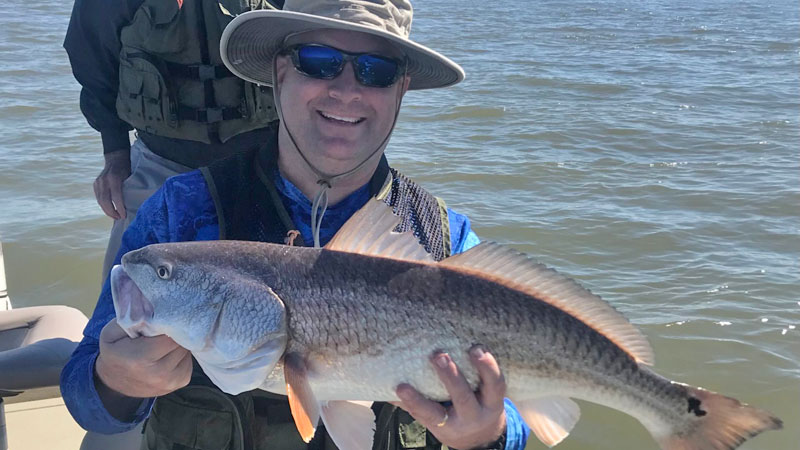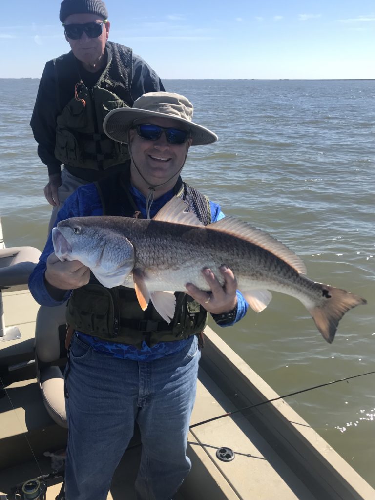 This nice red was caught by Addison Petitpain on March 2, 2022 while fishing with his daughter Camille Petitpain, 18, son Jacob Petitpain, 13, and father-in-law Bob Wack. It was caught near the new Rigolets Bridge while using live shrimp on weighted line.