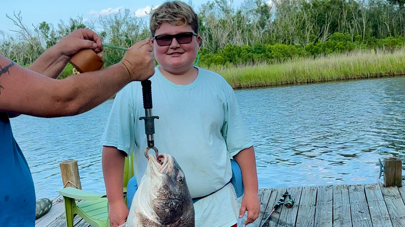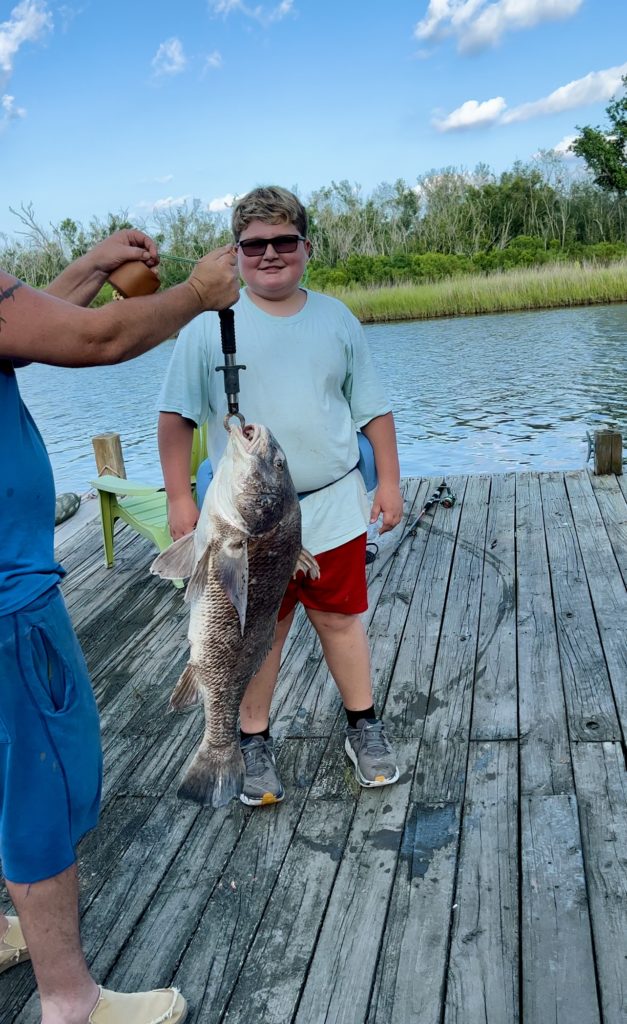 DJ Stilley, 11, from Albany caught this 35-pound drum at his fishing camp in Dulac. He was so tired from reeling this monster in that he had to have the help of his poppa to lift the fish for a picture.