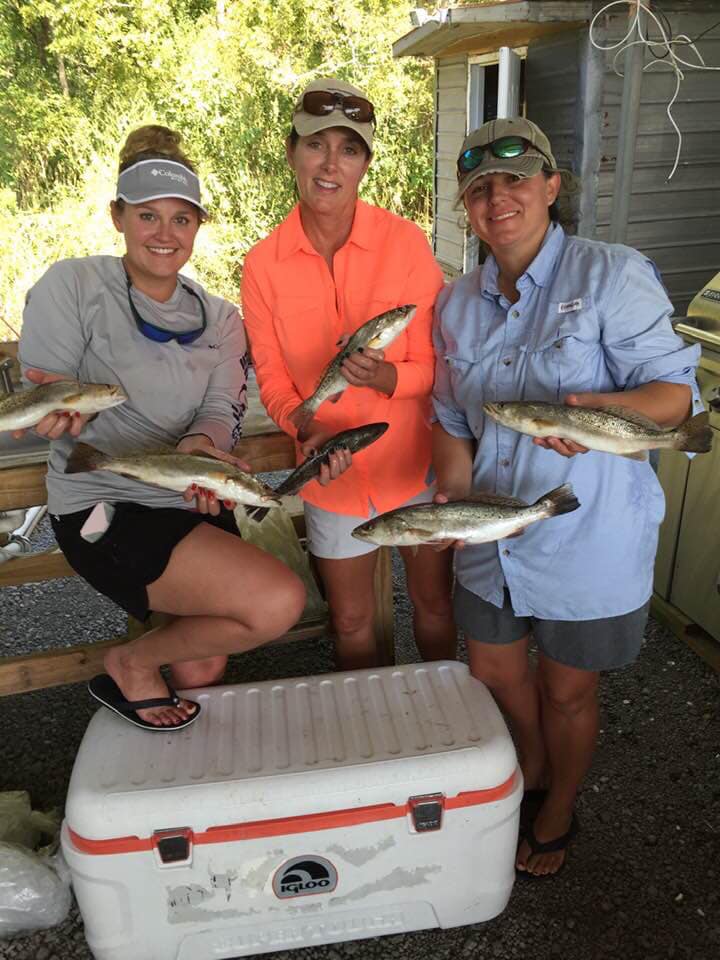 Three women who love to fish got together and hammered the trout in Dularge under the guidance of Capt. Ricky Brondum on Oct. 4, 2019. Pictured left to right is Ravin Andrus, Stephanie Leonards and Lambertina Odinet.