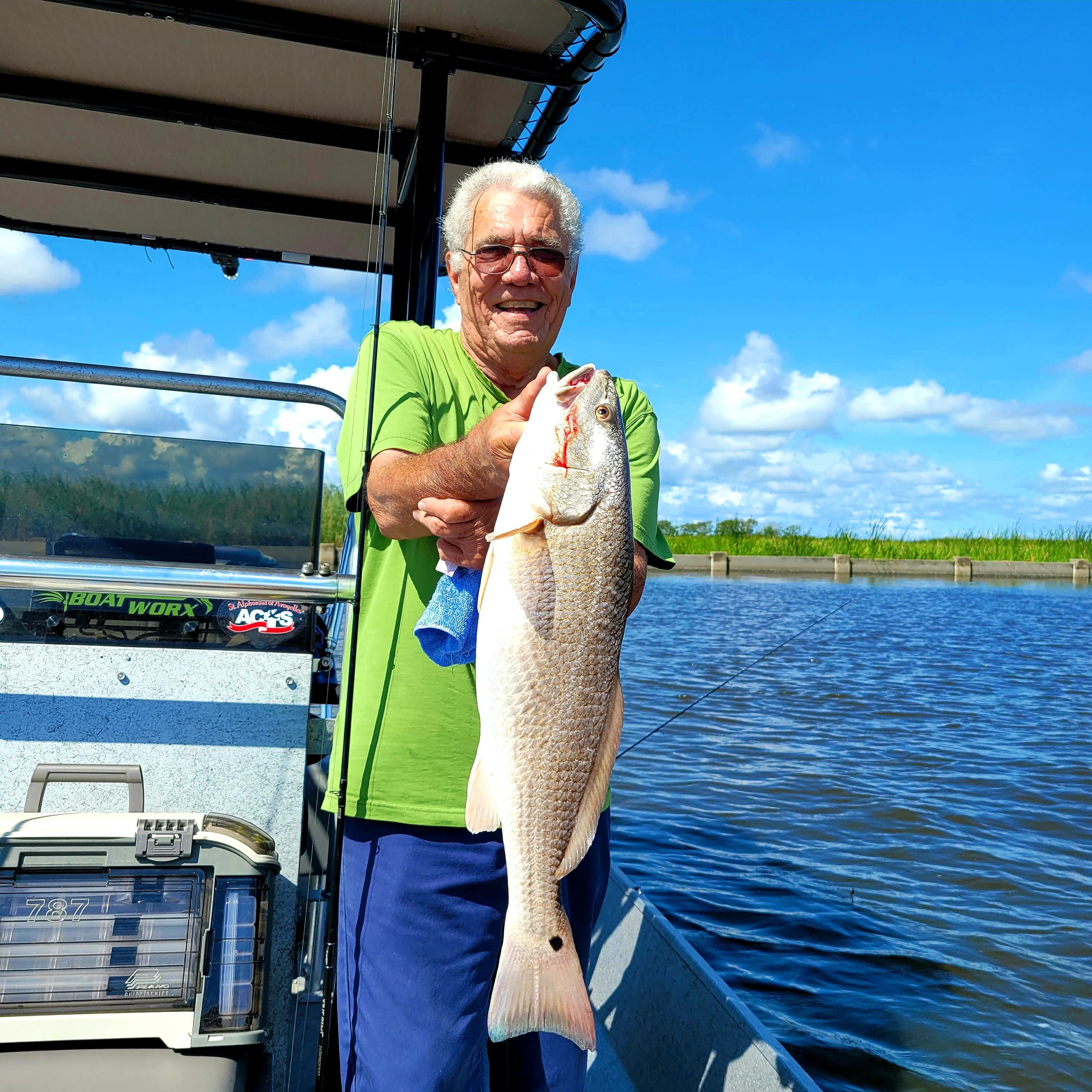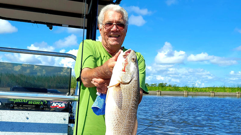 Ted Moreau, at 77 years young, is still catching redfish. This is one of about 40 he and his son caught and released in early July in Lafitte. Ted is having to use both arms to support his fish, because the reds wore him out!