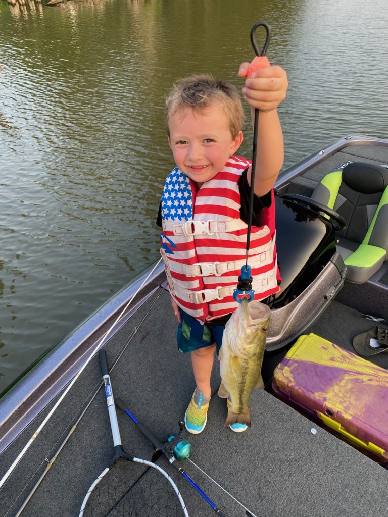 Hunter Coates, 5, holds one of the bass he caught using a Junebug red speed craw on Lake Verret fishing late in the evening along the cypress trees on Aug. 20, 2023. Hunter lives in south Louisiana and has loved fishing since he was big enough to cast a pole.