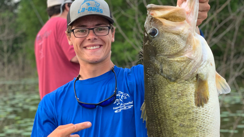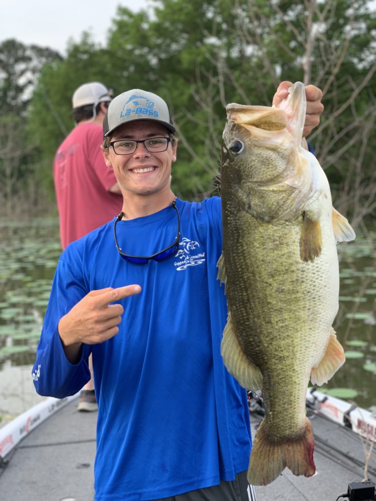 “After finishing my bass fishing state championship I asked my dad if we could visit a big bass lake the next day “on the way home.” It turned out to be a day I’ll never forget. The morning began with my buddy and I flipping bushes with some success boating a 4 pounder and a 2 pounder before a 30 minute lull. But that would all change after flipping into lily pads some brush and a submerged tree, the “big bass triangle.” When she bit it I couldn’t move her, she actually started pulling me into the tree. I knew I got a good hook set so I just started winding her out of the thick cover. I got her up to the side of the boat and my buddy reached out and lipped her to lift her in the boat. Once I finally calmed down, I worked to get the hook out, she was pegged good. After it was all said and done I had my new personal best bass in the boat at 12.63 pounds and over 27 inches long. After a bunch of pictures and video I let that fish swim away happy and healthy to be caught again some day to bring joy to another angler.”