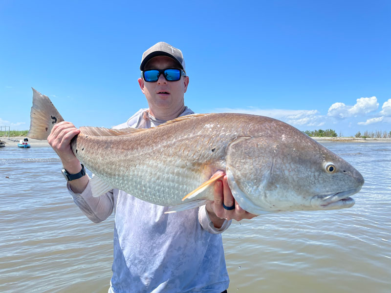 Justin King caught this monster bull red on light tackle on July 23. He was fishing on a barrier island mothership trip with Explore Kayak Adventures in the Quatre Bayou Pass area.