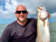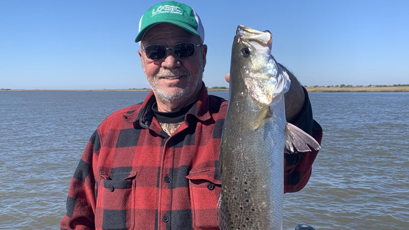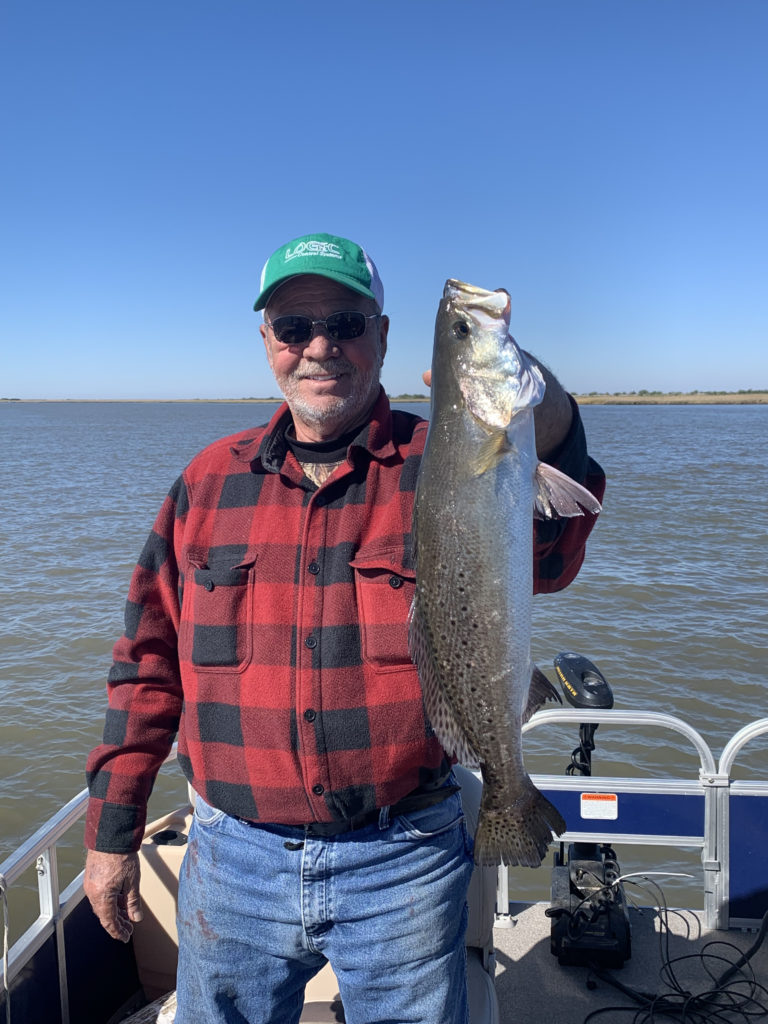 EJ Russell was having a rough morning under the Trestles on Nov. 7. The trout were eating all of the live shrimp and not making the legal length. The temp was around 44 and a little north wind as well. The tide was falling hard, which we hoped would bring on the big trout bite! The morning didn’t start well for sure, but EJ requested they move to edges of Lake Borgne and his first cast with a 3″ HH cocahoe (with a spinner) produced this beautiful trout and they ended up with several nice trout and a few reds too.