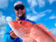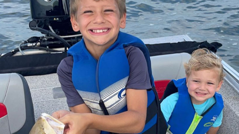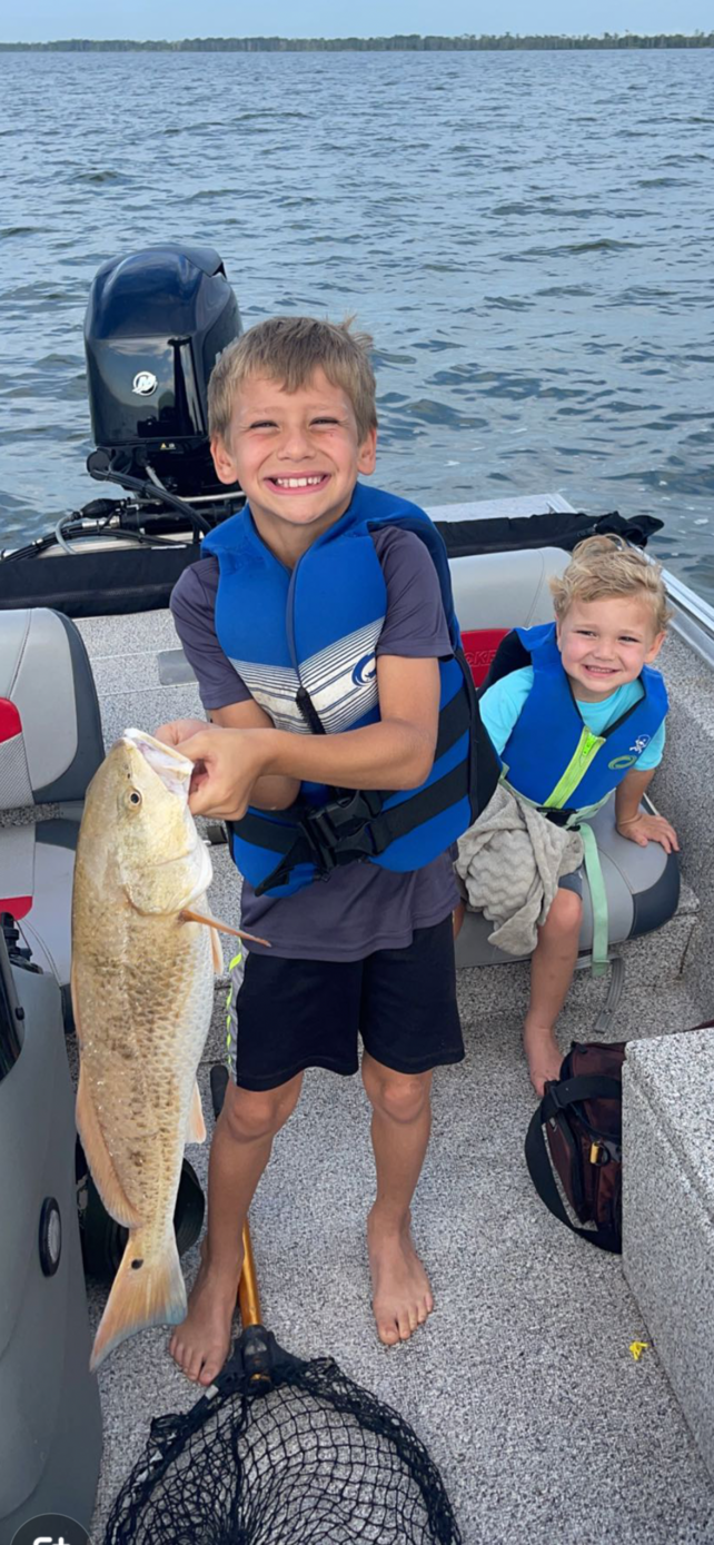 Jase and Jaxton LeBlanc with a Lake Pontchartrain redfish caught using bait shrimp while fishing the North Shore power poles.
