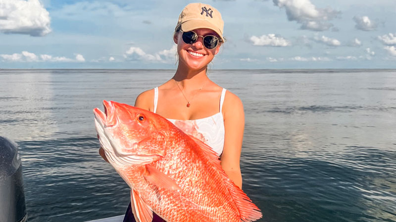 Bailey Trosclair with a red snapper caught off the coast of Venice. Bailey grew up in South Louisiana and learned how to fish as soon as she could hold a pole. She said being offshore and salty is her favorite way of existing and she wouldn’t trade the salt life for anything!