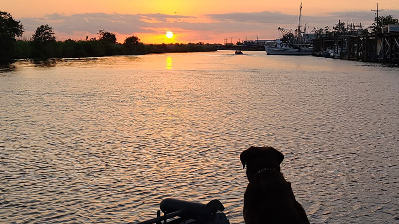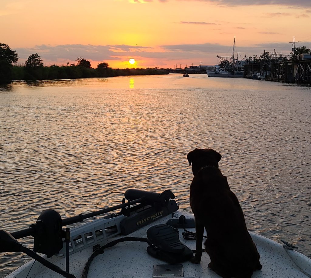 Mike Schonberg and his chocolate lab, Scout, head in to Delacroix after a great afternoon on the water chasing reds. Mike thinks Scout enjoys sunsets as much as he does.