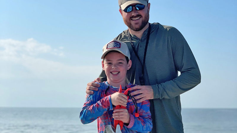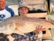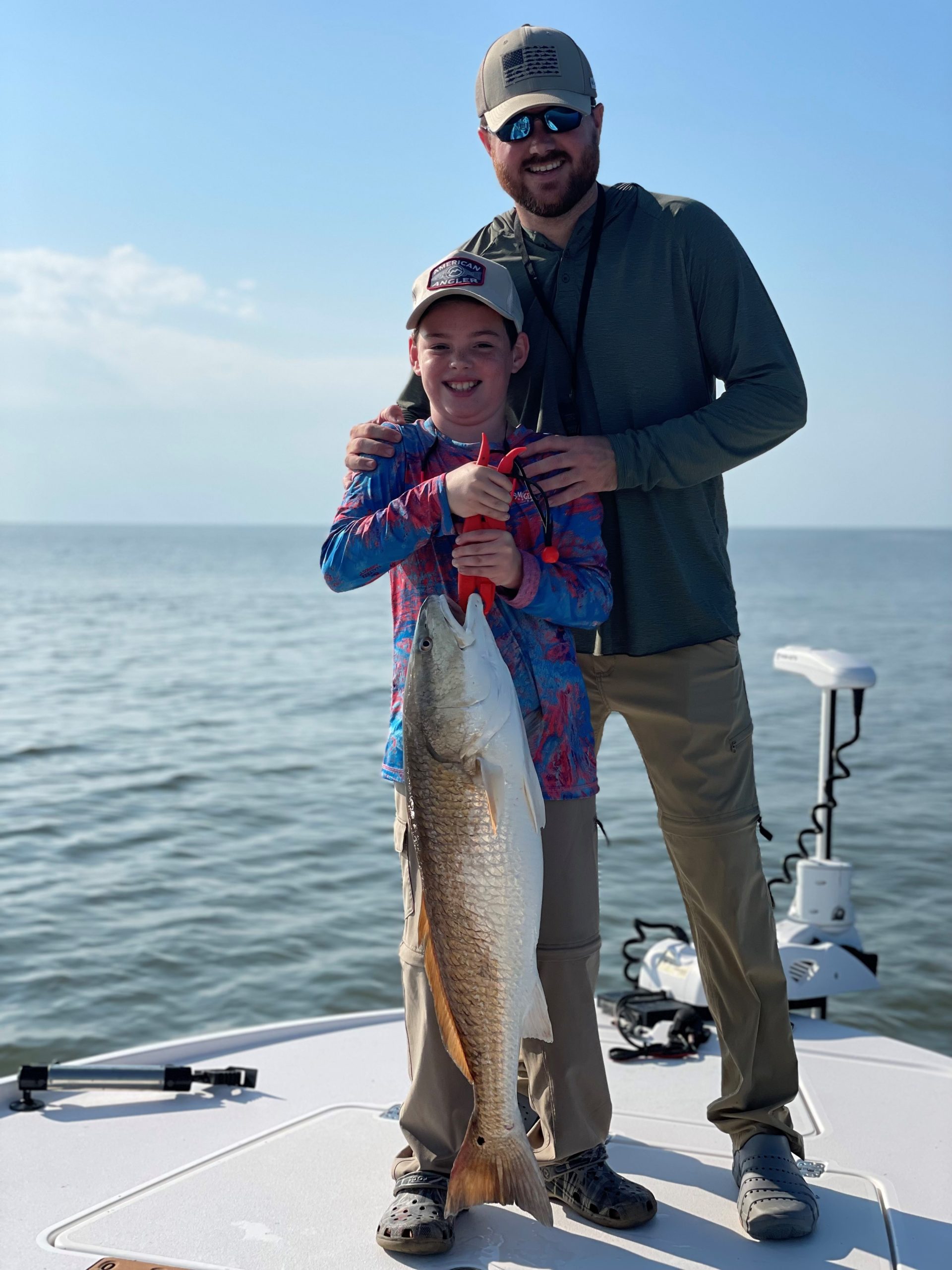 Stewart Latour, 9, and his father, Benjamin Latour, were fishing for big reds out of Bay Junop on Sept. 23, 2023. Stewart caught this 36-inch bull red fishing with Vudu shrimp under Four Horsemen corks.