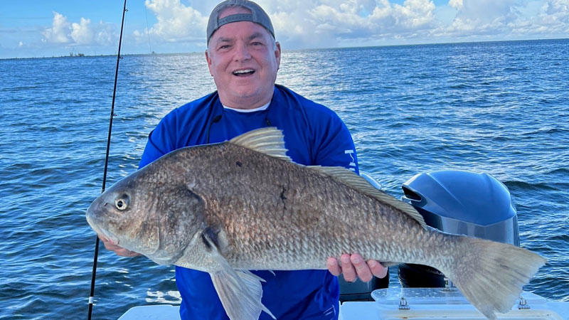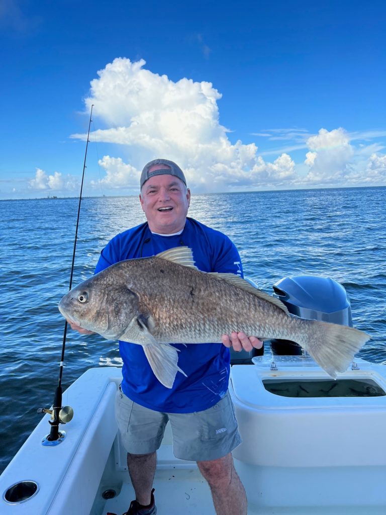 “Myself, my buddy Butch Detiveaux, my daughter Bailey and her boyfriend left Cocodrie to go fish Lake Barre for trout. We stopped at the Tracy Macie to get live croaker and live shrimp. We were rigged up to fish the bottom with a Carolina Rig with a kale hook. We fished a few structures and couldn’t find them. We tried boom shrimp under a Four Horsemen, but that didn’t work either. We finally found a structure where we started getting bites, but they were picking up the bait and dropping them. We soon realized we needed to free spool and let them take the bait. After around four nice 2-pound trout I had a good bump and then it took off, I set the hook and 20 minutes later, landed about a 25-pound black drum. I released him and put on another bait and cast out. Not long after that I hooked a nice fish, it was pulling drag and ended up around a piling. I thought for sure I would lose it. We let some anchor rope out and I was able to get behind the piling and got the fish out of the structure, 15 minutes later I landed a 25-pound redfish. Released him and baited up again, caught a few more trout and then hooked another big fish, this time he went around a cork for a crab trap. I for sure thought I was going to lose it, but the line was able to overcome the cork and rope and come free, 15 minutes later landed another redfish around 22 pounds I. released him and rebaited, caught a few more trout and then hooked an 18-pound redfish, 10 minutes later landed and released him. All in all we caught 3 redfish, 1 drum and 27 trout, not a bad day. My Shimano Calcutta 200B with 15-pound spiderwire got it done on a Berkley 7′ medium rod.”