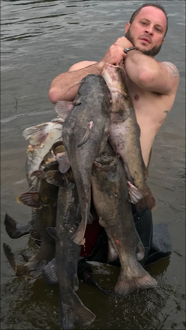 The water temperature was in the low 70’s on May 14 when Russell Smith ended up with nine flatheads. He was noodling from concrete with sandy bottoms near the river in Toledo Bend in about 3 to 5 feet of water. This was the early spawn. He said the young males and females always move in earlier.