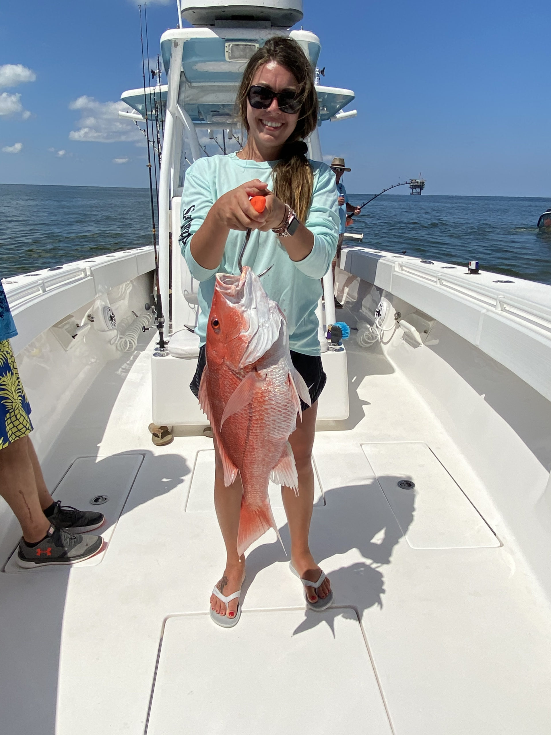 Ginny Brown with her first red snapper. It was her first offshore trip. She was out with Capt. Gray Long (Go Long Charters), out of Cypress Cove in Venice on June 19. She also caught her first yellowfin tuna on this trip! The seas were calm, weather was great, fishing was excellent, and a great time was had by all aboard!