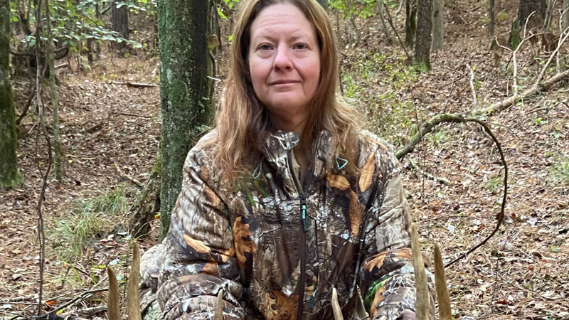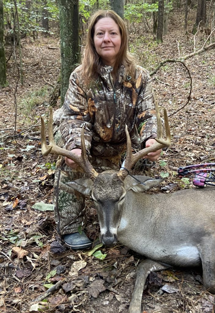 “I have been hunting this buck for 2 years and he he had been giving me the slip. I would be at work and my camera would go off and he would be in the food plot. My day off I would sit all day and as soon as I would leave he would come out. I finally decided he was laid up beside the trail I walked in on. This year, I tried something different. I walked in the back way a couple days and saw a bunch of does and smaller bucks. On Oct. 17, 2021, the big buck and two other smaller bucks came out. The two other bucks where fighting amongst themselves while he was eating on a block I had put out. I was waiting for him to turn for a clear shot. My Apple watch was vibrating and lighting up and I’m thinking he is going to see or hear it because he is only 30 yards away. I’m thinking to myself what is so important that my husband, sister or children need. They know better! Lol After I shot, I climbed down out of the stand found piles of blood so I knew it was a great shot. I then looked at my watch to see was who it was and it was telling me to “BREATHE.” My husband, Keith, came over with our dog Lori and within 10 minutes she had him located.”