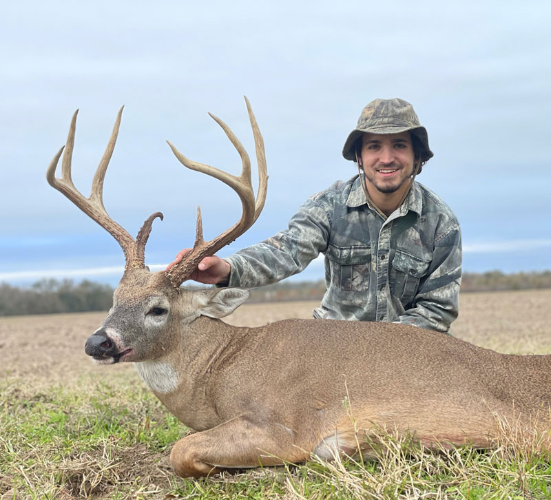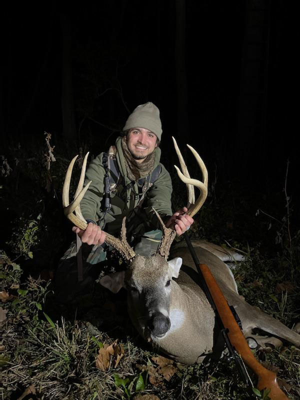 Fast forward to deer season in Concordia Parish. Since the purchase, I had been looking forward to the opportunity to take the stand with this special gun. This was going to be a different approach, especially using a shotgun sporting a 36-inch barrel. Patterning the gun was a breeze and I felt confident heading out with my new-to-me firearm. As common in Louisiana, the second weekend of the season had a warm south wind that had limited me to trying a corner of the property that had never been hunted. Even though it was close to the camp, I always felt it held good deer. After contemplating the decision of hunting the spot, at around 3 o clock, my uncle helped me load up a lock on and we quickly made a move. Keeping the wind and the close range of the shotgun in mind, we found the perfect tree. Once I got settled I started to see some action. Based off of the trails surrounding the area I was hopeful a deer would make it’s way in range. I heard leaves crunching and looked to see 3 does feeding and appeared to be coming down the trail that leads almost under my tree. Seeing the wind was perfect, I got excited. While watching as they feed and make their way into range, something was telling me to hold off on filling my doe tag. Getting closer to dark, I keep watching as they come closer and closer, and out of the corner of my eye I see movement. It’s a giant, and he seems to be coming to me. The does get closer and closer, to the point where I almost can’t see them because they are directly under my tree. Seeing that the buck wasn’t worried about much, the does seemed to be okay as well. He’s coming straight for me, following near the same trail. I had my binoculars in my lap, but being covered in deer, I couldn’t move them to get a better look, not that I needed one anyway. He’s now in range and I know I need to get a shot off soon. At about 10 or 15 yards in front of me, I’m inching my gun up to where I can take the shot. Mind you, my binoculars are still on my knee. As I’m getting ready, my binoculars slipped off of my knee only to fall roughly 25 feet to the ground almost hitting the does under me. My heart dropped. As quick as the fall happened, and as fast as the does take off, I look up to see he has not moved at all. I stand up, get my bead on his shoulder and pull the trigger. I see his shoulder buckle and the buck fever began. I knew it was a perfect shot. In the midst of not being able to breathe and almost shaking out of my seat, I try to call my uncle and my mom only to not be able to get a word out. I may have almost said “I shot a monster.” They’re on the way. Shaking and trying to catch my breath until the sound of the UTV got closer, I was confident it had happened. I climb down and finding absolutely no blood my heart sinks. Using buckshot and that being part of the game, we looked around and finally found him about 50 yards away, and he was much bigger than I thought. At 247 pounds, and scoring 151 inches as an 8-point, he is one of the biggest deer I have ever seen. You could not have planned it any better. From buying the gun from the sweet lady at the gun show, to the last minute decision to set up a stand in a never before hunted area, it was perfect. God had blessed me with this experience and walked me through it the whole time. I am more than grateful for being able to carry on the life of that shotgun, and even more thankful for being able to harvest such and incredible animal with it.