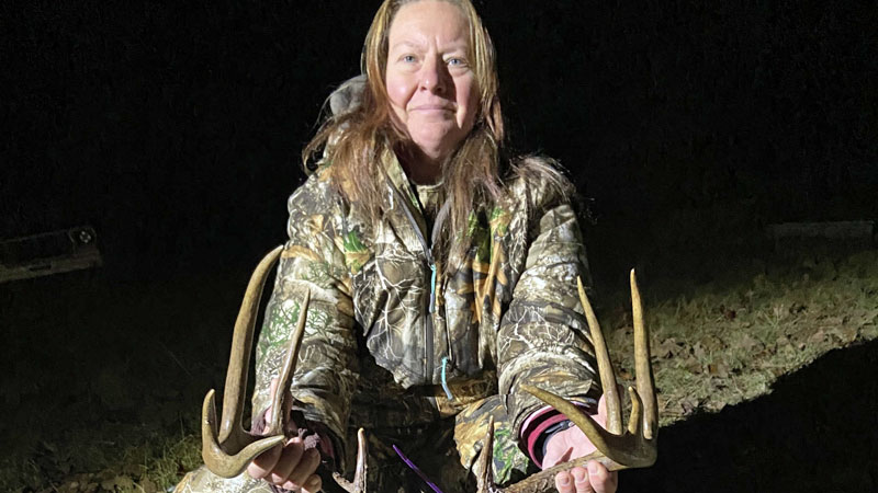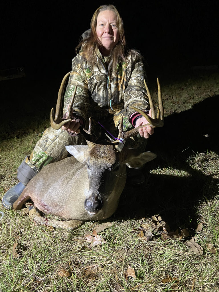 “My mom quit hunting 7 years ago due to her knees and not being able to walk to her stand so she forfeited it to me. I had my cell cameras out and my nephew had the app on his phone also. On Dec. 19, 2021, I was in my mom’s old stand watch two does they was very nervous. They keep looking behind them. Dark was closing in, in the far right of the shooting lane I seen a glimpse of a big deer go across. It was headed to the buck scrape I had made on the way in. The check it and came on up to the next one. By then the 2 does had bolted and ran off and the buck came on in the food plot. My nephew was in Utah on the rig working and texted my to tell me that big 10-point was at mom’s old stand., but I couldn’t or wouldn’t answer him. The deer would not turn sideways and give me a shoulder shot so I had no choice but to shoot him in the chest the 35 whelen. I know that’s not the best placement but with only 2 minutes of legal shooting light left you got to go for it and I have made that shot a dozen times successfully. I got out of the stand, found blood, and got my dog Lori. She went about 40 yards and located my 18-inch 10-point.”