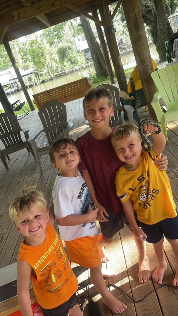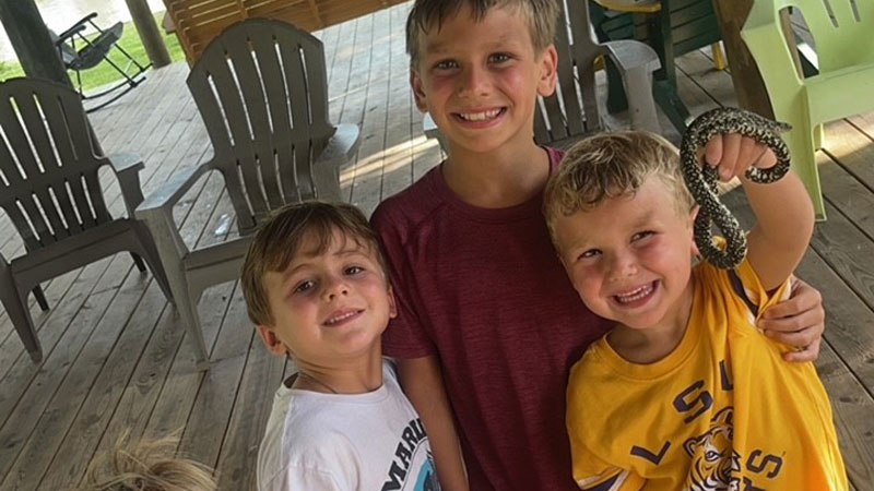 Jaxton LeBlanc, 4, pictured with his river friends holding a Speckled King Snake they caught at his family’s camp on the Tangipahoa River.