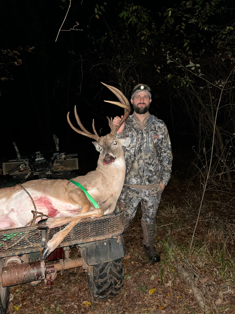 “I’d been getting photos of this deer all year but could never catch up to him. I got a pic of him on Tuesday at noon in the daylight and had a Thanksgiving to go to on Friday. Friday morning the Thanksgiving got canceled so I had free time so I loaded my stuff up and was going to make an evening hunt and I got 2 miles from my camp and my transmission went out in my truck so I coasted to the camp and was thinking about what I was going to do about the truck then I thought to myself I can think about that on the deer stand so I finally made it to the stand and he stepped out at 150 yards at about 4 p.m. and it was over with.”